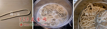 8、坐一锅热水,水里加1茶匙盐,下入面条煮熟。