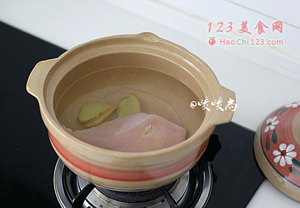 5、将焖煮好的鸡胸肉取出晾凉,用擀面杖敲打一下后撕成丝。