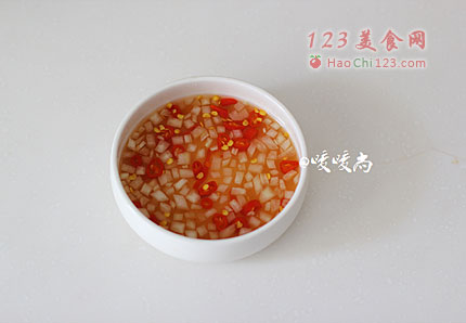 4、鱼露、凉白开和白糖调匀,挤入1个青柠汁,加入切好的小米椒碎调匀作为料汁(1个小米椒就足够辣了)。