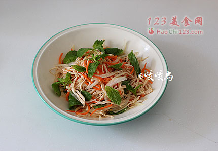 6、柠檬叶、鸡丝、胡萝卜丝和洋葱丝混合,调入步骤4调好的料汁拌匀即可食用。