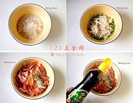 做法:1、金针菇切去根部,用沸水焯烫至软,浸入冷水过凉。