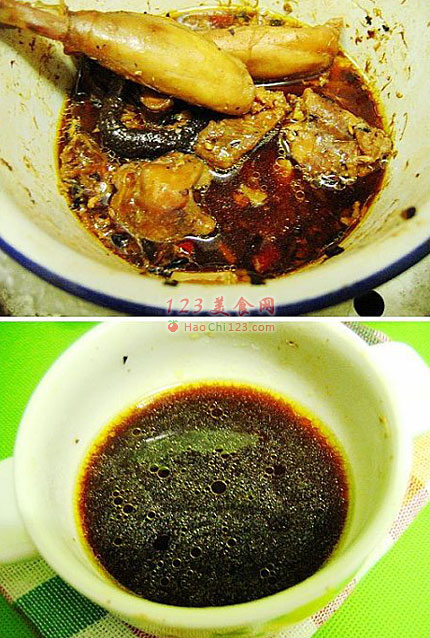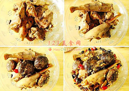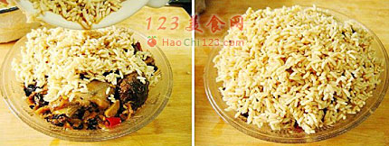 3、再把没吃完的鸡肉、香菇和调味料铺碗底。