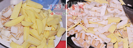 5、土豆和莲藕如果不想用油煎,可以用水焯一下。