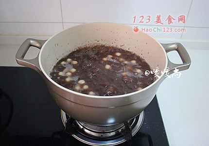 5、待红豆出沙,汤汁变得浓稠后下糯米小圆子煮至熟透飘起即可关火食用。