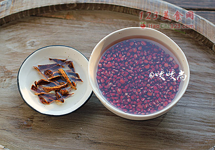 4、泡好的红豆、陈皮丝和冰糖放进汤锅内,加足水,大火烧开转小火煮30-40分钟。