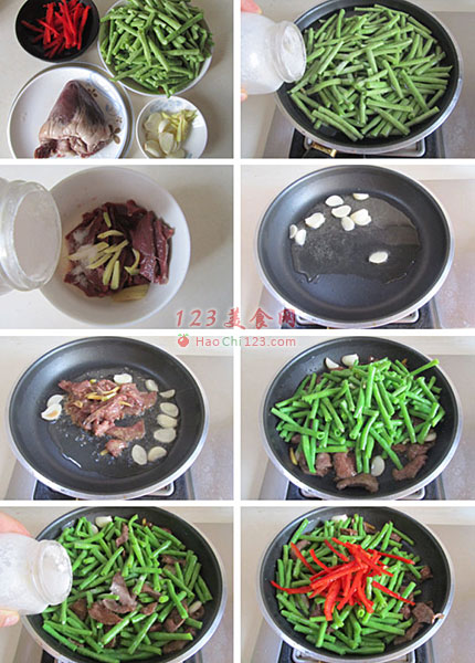 6、猪心煸炒变色后下入豆角进去翻炒;