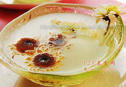 3、此菜特点:口感清爽,外观晶莹剔透,入口既有淡淡的酒香,又带着菊花清新的香气,十分迷人。菊花有清热败火去毒的功效,这道菊花冻适合凉吃,更能清热解毒。[sushi.laoyanhuo.com]