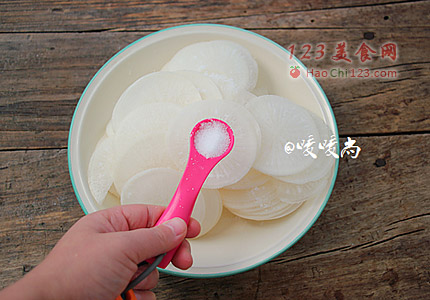 2、一层白萝卜一层盐的码放,然后抓匀让萝卜腌制半小时出水。