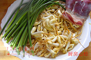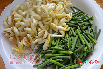 2、去掉花生芽的根须,保留花生米及芽。蒜苔切段。