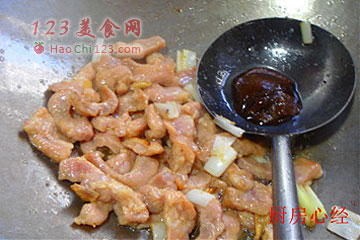 7、调入甜面酱、料酒、酱油、盐、白糖后,炒香。