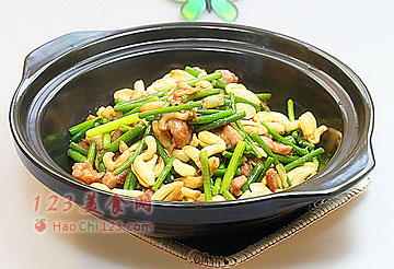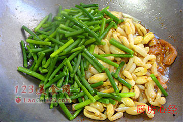 8、倒入蒜苔、花生芽后,快速炒匀。