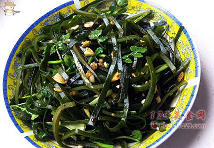 4、把调好的汁淋到海带丝上,放上香菜即可。