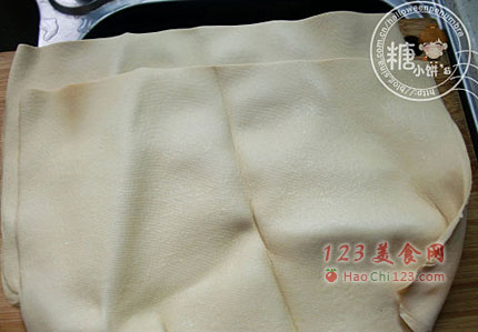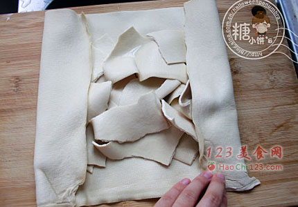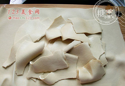 2、其中一张撕成大片摆在中间(这样做是为了切面有不规则的花纹,好看)。