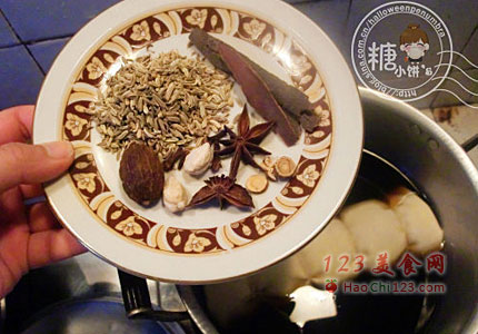 5、放在小锅内,加入水,料酒,酱油,糖以及卤料(用量如图)。