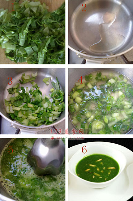5、煮一分钟用料理棒绞碎。放青菜略炒。