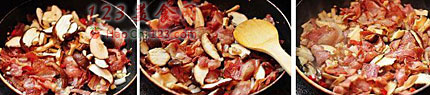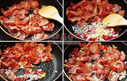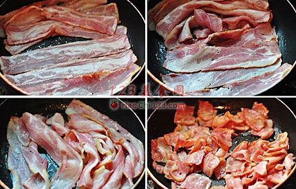 3、培根的油脂够多了,这道菜完全可以不放油,如果锅子比较怕粘,也可用少许的油在开始引一下。