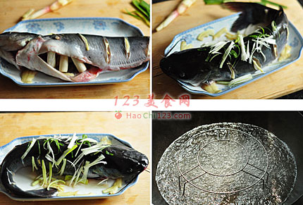 2、蒸鱼要水开后再放鱼,盘底垫姜,鱼侧铺在姜上,或者葱段撑开立着蒸,都有助于让鱼身和盘子间有空隙,方便蒸的更透。