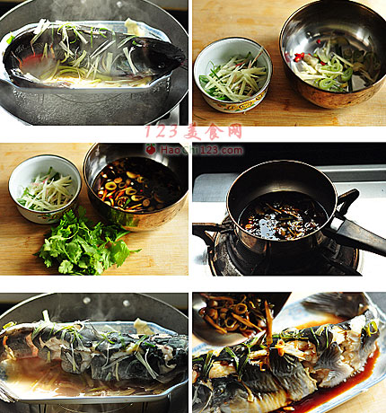 4、去腥的几处因为知识有限,我只知道鱼腹腔及鳃部要反复清洗,黑膜污物要去净,此外就是刚蒸完鱼时鱼盘里的水要倒掉再重新浇汁。