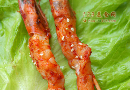 2、如不考虑外形问题,大虾可以不用串竹签,直接烤制。