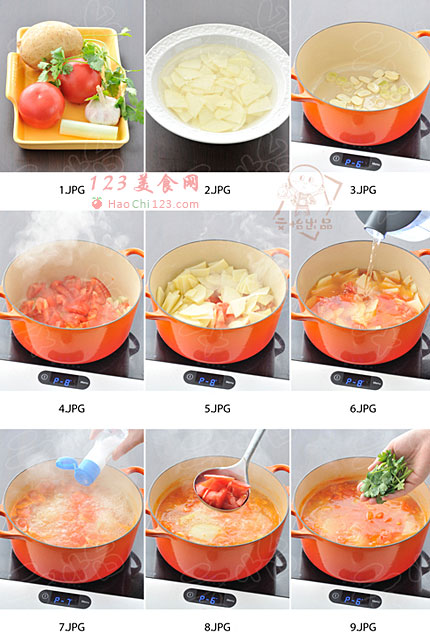 7、汤里的西红柿最好分两次放入,先放的2/3是为了把汤煮浓郁,后面放的1/3一是能让成品更好看,还能吃到整块的番茄,口感更好。