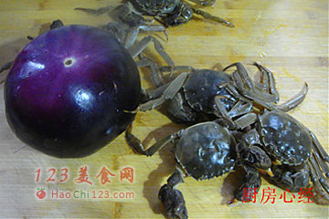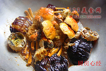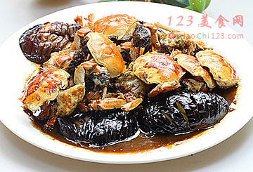 7、将码好的茄子以及蟹块,小心的推入锅中,用中火将汤汁收浓。即可出锅,滑入盘中,保持造型。