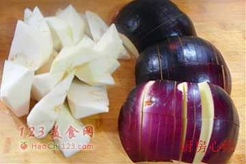 2、一个圆茄子,将底部和顶部削平,然后切出三个半圆,剩余的茄子,切成大块。其中的半圆茄子,要打上一字的花刀,不要切断。