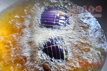 3、入油锅炸熟,茄子块也要炸熟,然后码在盘中待用。
