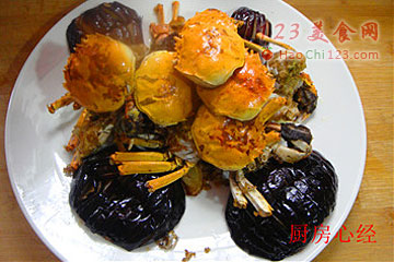5、入油锅炸制蟹块,硬挺以后,即可捞出码在茄子块上面。在盘中码好造型。
