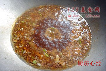 6、起锅放油,爆香葱姜蒜,放入甜面酱炒香,调入料酒;酱油;白糖后,冲入开水。