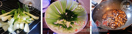 3、小油菜切去根部洗净,焯水摆在碗里备用。