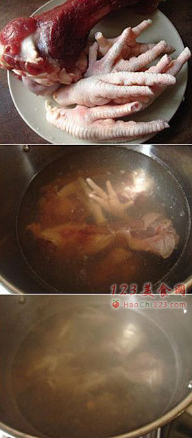 2、将洗好的棒骨和鸡脚一起入冷水锅焯水,焯水时可以加点姜片姜段和料酒,水烧至开后取出材料,用湿水再清洗一遍,保证无血污和浮末杂质。