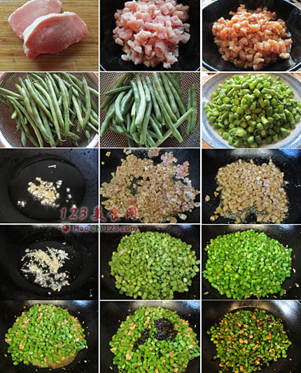 5、加入四季豆丁,炒到四季豆变色,大概八成熟的时候,放盐翻炒均匀。