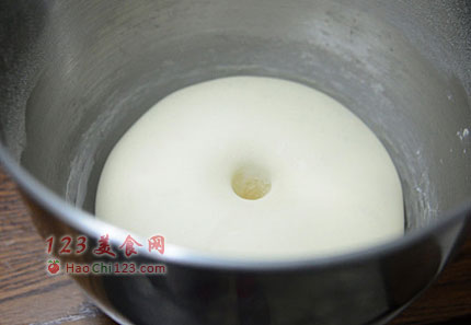 2、揉好的面团盖保鲜膜放在温暖处进行基础发酵至2.5倍,手指沾面粉戳孔,不塌陷不回弹。
