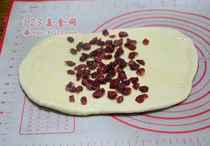3、将面团按压排气,放入冰箱冷冻松弛20分。(冷冻是为了后面好整形,冻到面团变硬但是可以擀开的程度,具体时间长短会受由面团厚度和冰箱温度来决定)取出冷冻松弛好的面团,擀成面片,刷一层蜂蜜,中间撒上切碎的蔓越莓。