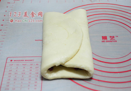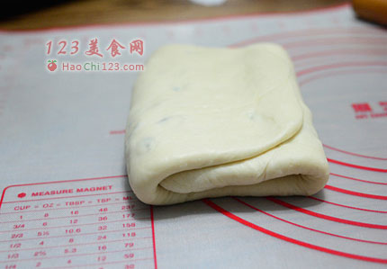 5、顺着上下方向擀长。上下分别向中间1/3处再次折叠。