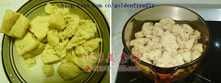 4、後放入瀝乾的烤麩,加入所有調味料後拌炒。後加蓋,小火悶約5分鐘。開蓋,開中火將醬汁收乾即關火。