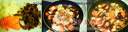 3、起一油鍋,鍋微熱後放入做法2中所有材料。稍作拌炒。