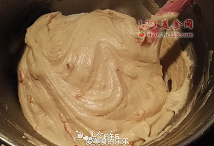 6、搅拌均匀,黄油打发到位,加入粉类不会消泡,拌好的面糊,可以看到是光滑细腻有光泽的。