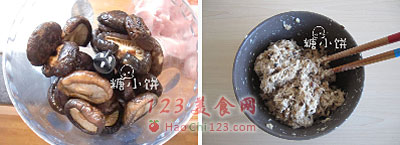 2、肥瘦2:8的猪肉糜加绍兴酒1汤匙向同一个方向搅打至上劲,加入淀粉、五香粉和盐搅匀后加入香菇碎拌匀。