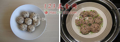 3、挤出肉丸的形状,排入深盘中。