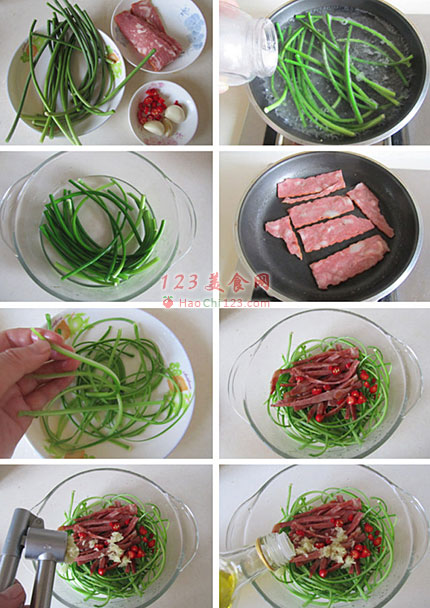 1、焯熟蒜薹时放入几滴油和少许盐,这样能保持蒜薹的翠绿。