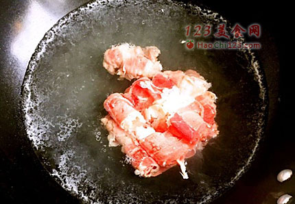 2、锅中加入过滤水,烧开后,将肥牛片放入焯一下,捞出备用。