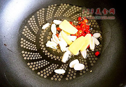 3、锅中放入少许油,烧到5成熟,放入蒜片、红辣椒、姜片煸香。