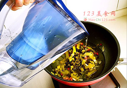 4、倒入酸菜继续煸炒,放少许白醋,然后加入适量的过滤水,烧开煮5分钟。