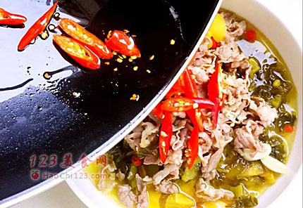 6、把焯过的肥牛片放入锅中继续煮开,加少许鸡精调味,让后连汤一起倒入盘中。
