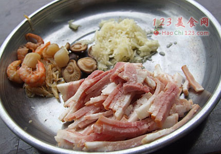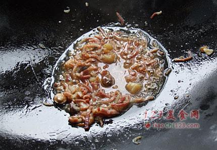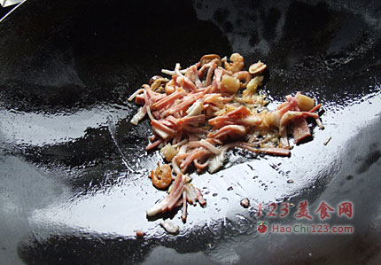 4、再加入虾米,瑶柱,虾皮和培根丝炒匀。