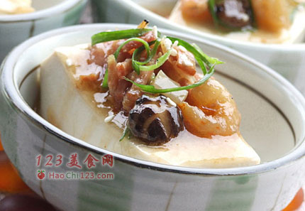 6、将芡汁淋在豆腐上,加上葱丝和芝麻即可。