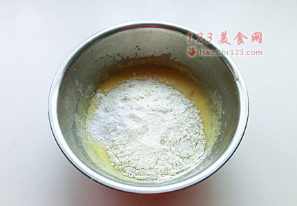 3、将中粉和泡打粉混合过筛入液体材料中,以刮刀翻拌混合至有少许干粉的状态。