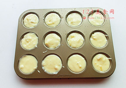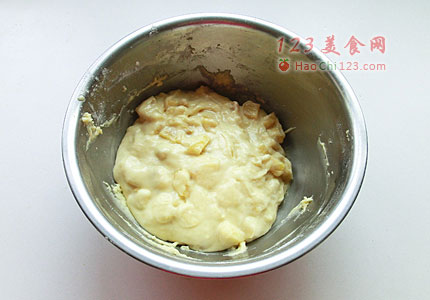 4、凤梨切1CM左右的丁。与面糊翻拌混合,此时干粉消失。
