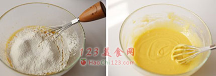 2、加入过筛的低筋面粉和一丢丢泡打粉轻轻拌匀备用。